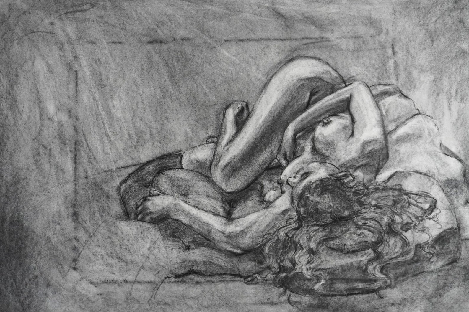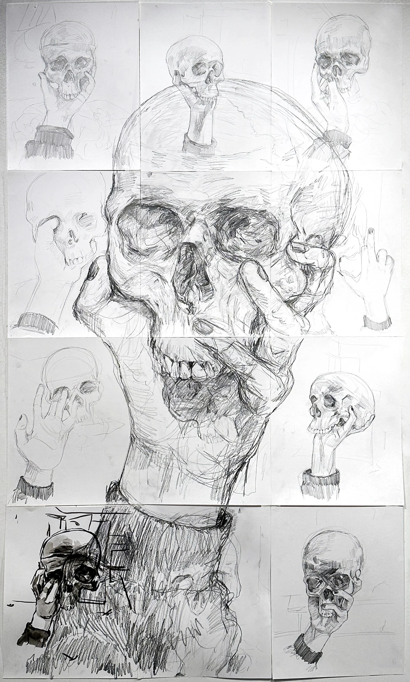 Create twelve drawings of your hand interacting with an object, each in a unique position. Combine these drawings into a single large surface, then create an enlarged drawing of your hand and the object across the entire composition, working from observation.