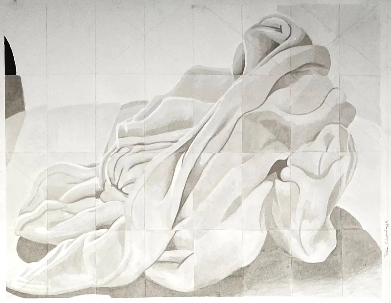 Prompt: Draw fabric, then transfer your drawing to a larger paper using the grid system. Transfer each square of the grid independently, covering and not looking at the other parts of the grid.
