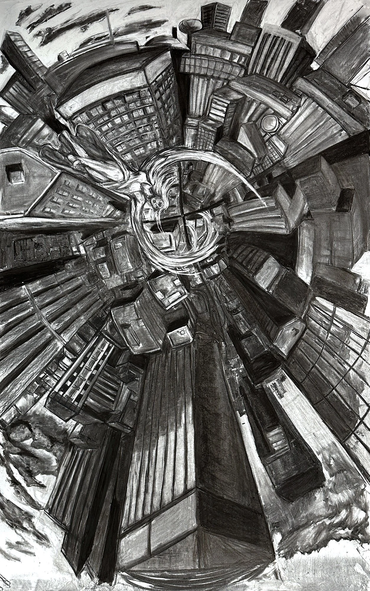 Prompt: Create a dramatic perspective drawing that explores extreme spatial distortion. Construct a composition that curves, tilts, or collapses space to emphasize depth, scale, and movement. Focus on converging lines, overlapping planes, and tonal contrast to guide the viewer’s eye through the composition and create a sense of immersion or disorientation.