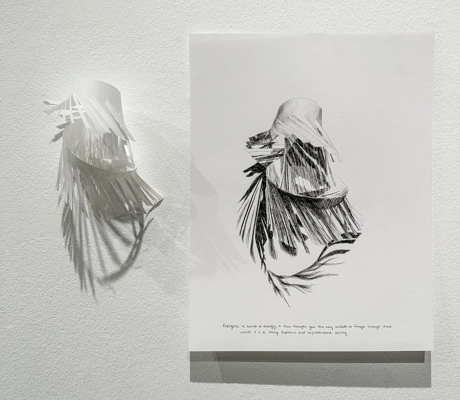 Prompt: Make a sculpture expressing an emotion using only white paper. Light it in a way that produces shadows. Then, make a “field drawing” with notes as if you found the emotion in the wild.