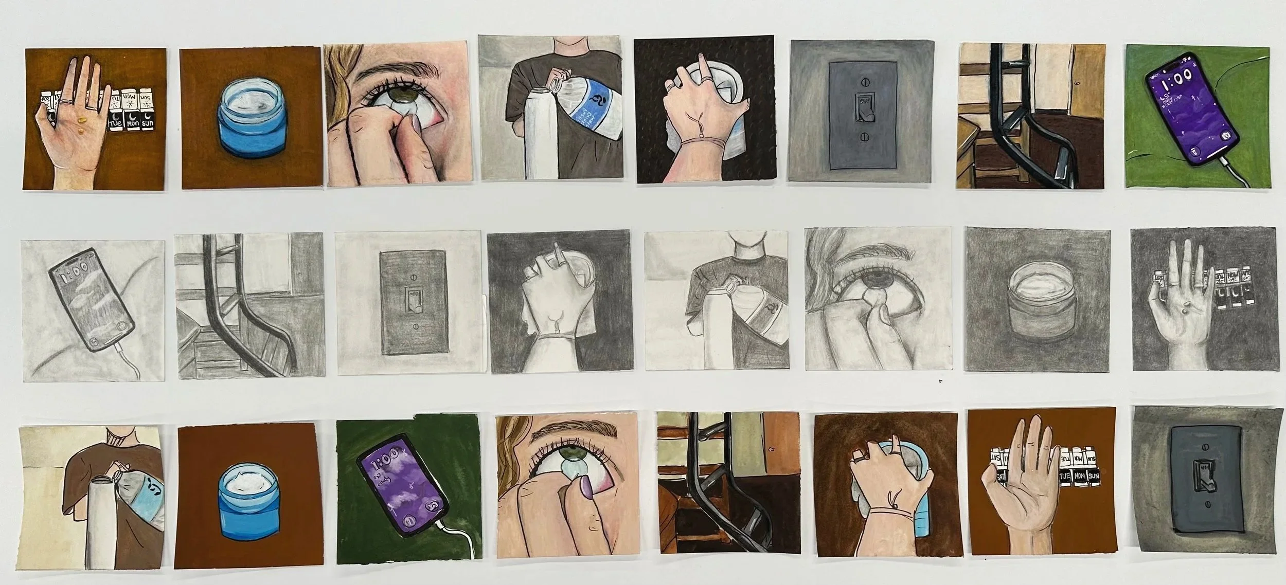 Students translate a personal daily routine into a narrative sequence across media. They begin with a written reflection, they then document the routine as a short edited video video with sound, then translate key moments into a sequence of images that are repeated and rearranged to generate multiple narrative possibilities. Students explore how meaning shifts through editing, repetition, and material decisions.