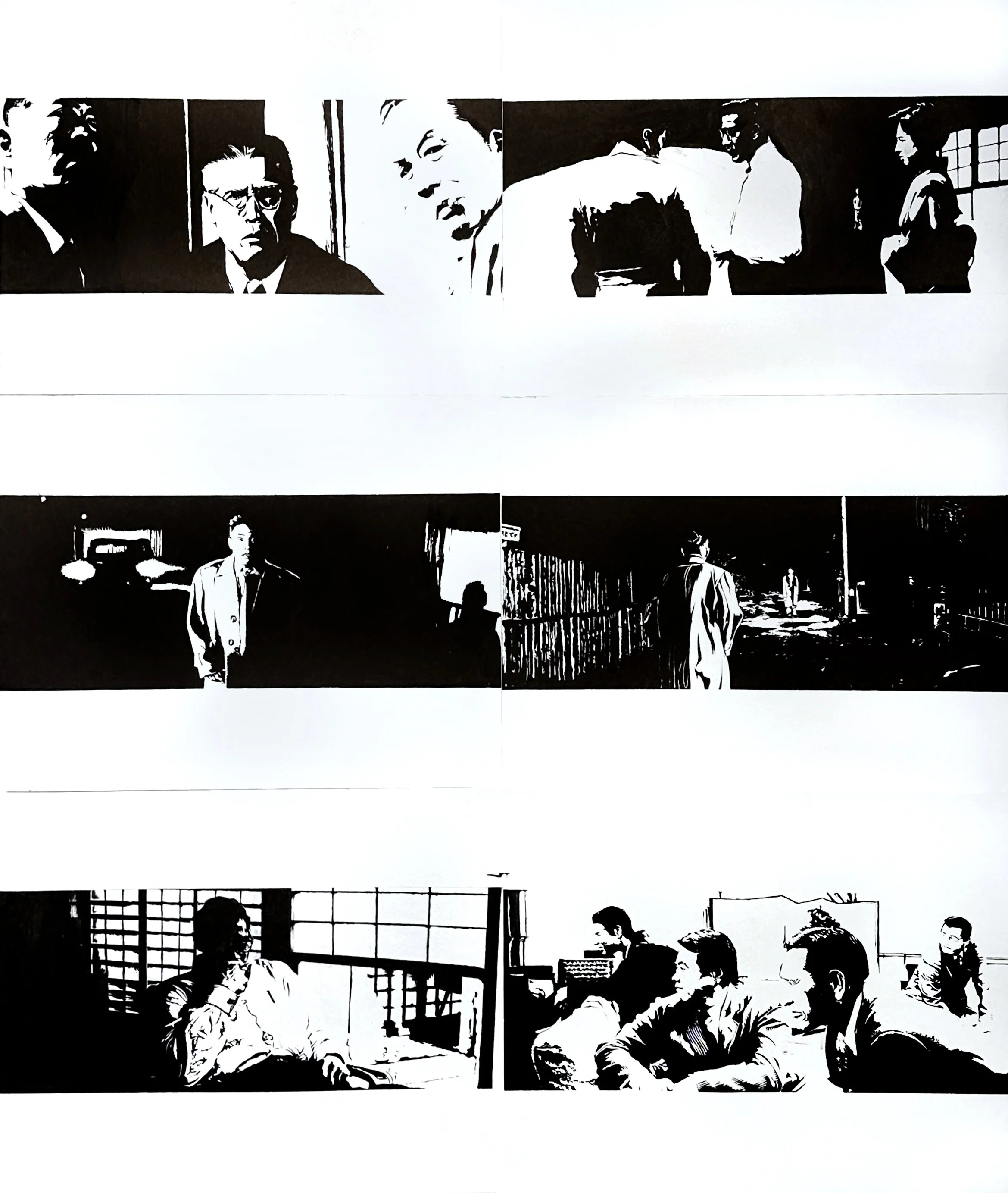 Prompt: Create a series of narrative drawings that distill key moments or scenes into high-contrast black-and-white compositions. Focus on capturing the essence of the scenes through light, shadow, and compositional framing. Consider how negative space impacts each composition.